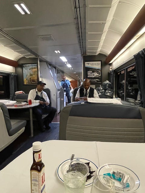 Last week, Ms. Wife and I enjoyed a train ride. This wasn’t one of those tourist journeys on a steam engine that chug you off to a little town for lunch and a peek at the scenery. This was the kind of train ride where you reserve a room for the night and eat in a dining car with strangers who could become instant friends.